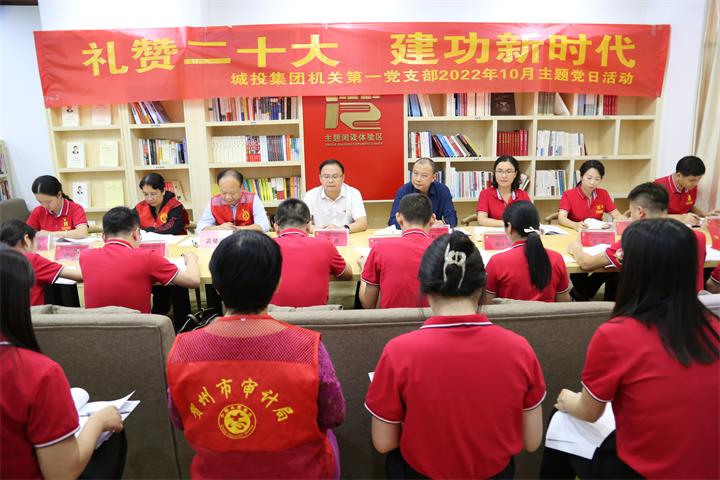 發(fā)布時間:2022-11-01 作者:圖文/吳姍 來源:本站原創(chuàng) 審核:葉茂桃 鄧永劍為深入學(xué)習(xí)貫徹黨的二十大精神,10月31日,城投集團(tuán)機(jī)關(guān)第一黨支部在市人才公寓開展“禮贊二十大建功新時代”10月主題黨日活動。集團(tuán)黨委書記、董事長黃俊,黨委副書記、工會主席梁輝露,黨委委員、紀(jì)委書記吳澤蓮以普通黨員身份參加活動。市審計(jì)局黨組成員、經(jīng)責(zé)分局局長黃健斌率市審計(jì)局赴城投集團(tuán)審計(jì)組成員參與活動。支部書記湯彩燕主持會議。支部全體黨員參加活動。